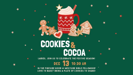 Save this date for our 2025 women's Christmas party! Come to "Cookies and Cocoa" informal gathering from 10:30 am-noon in the Fireside Room at Westside Bible Fellowship for some holiday fun and cozy drinks. Love to bake? Bring a plate of Christmas cookies to share. Bringing a friend is also encouraged! No signups are required.